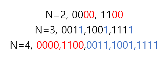 지원이에게 2진 수열을 가르쳐 주기 위해, 지원이 아버지는 그에게 타일들을 선물해주셨다. 그리고 이 각각의 타일들은 0 또는 1이 쓰여 있는 낱장의 타일들이다. 어느 날 짓궂은 동주가 지원이
