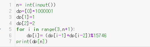 먼저 문제에서 가장 최대로 주어진 수의 +1만큼의 공간을 리스트로 선언하고 값들은 15746으로 나눈 나머지 값들로 채워준다.