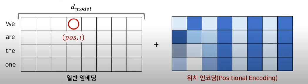 i가 짝수일 때는 sin함수를, 홀수일때는 cos함수를 사용하여 표현한다. 위 공식을 활용해 구한 값들을 그림 7과 같이 임베딩에 더함으로써 위치 정보를 반영할 수 있다.