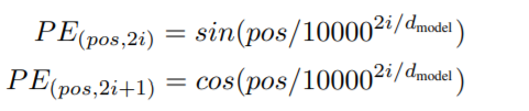 pos와 i가 단어의 임베딩 위치를 알려주는 요소로, pos는 어떤 단어를 가르키는지, i는 pos 단어 중 어떤 임베딩 위치를 가르키는 지를 알려준다. d(model)은 임베딩 차원이다.