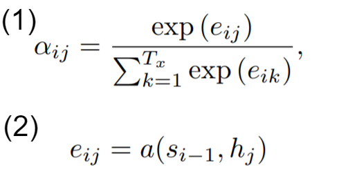 i는 현재 디코더가 처리중인 인덱스를 의미하고 j는 각각의 모든 인코더 출력 인덱스를 의미한다. 따라서 s(i-1)은 이전 순서의 디코더에서 나온 출력값을 의미하고 h(j)는 인코더의 처리중인 인덱스에 대한 모든 출력값을 의미한다.