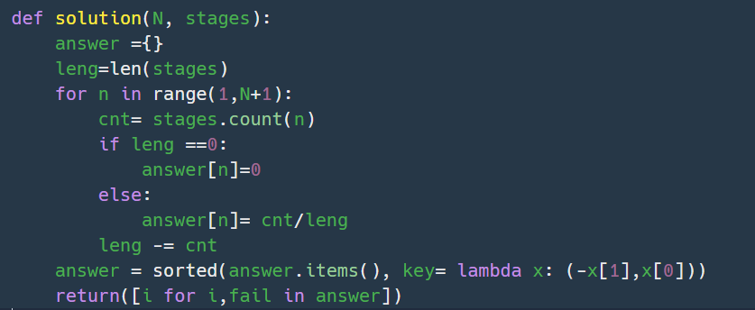 딕셔너리를 선언해서 key값엔 stage 단계, value값엔 실패율을 담은 후, sorted로 정렬했다.