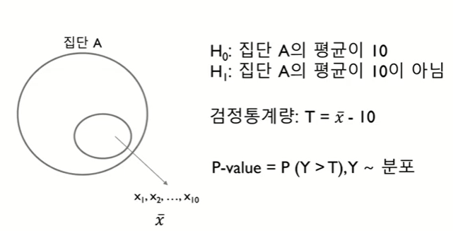 여기서 귀무가설은 '모집단 A의 평균이 10이다'이고 대립가설은 그 반대이다.