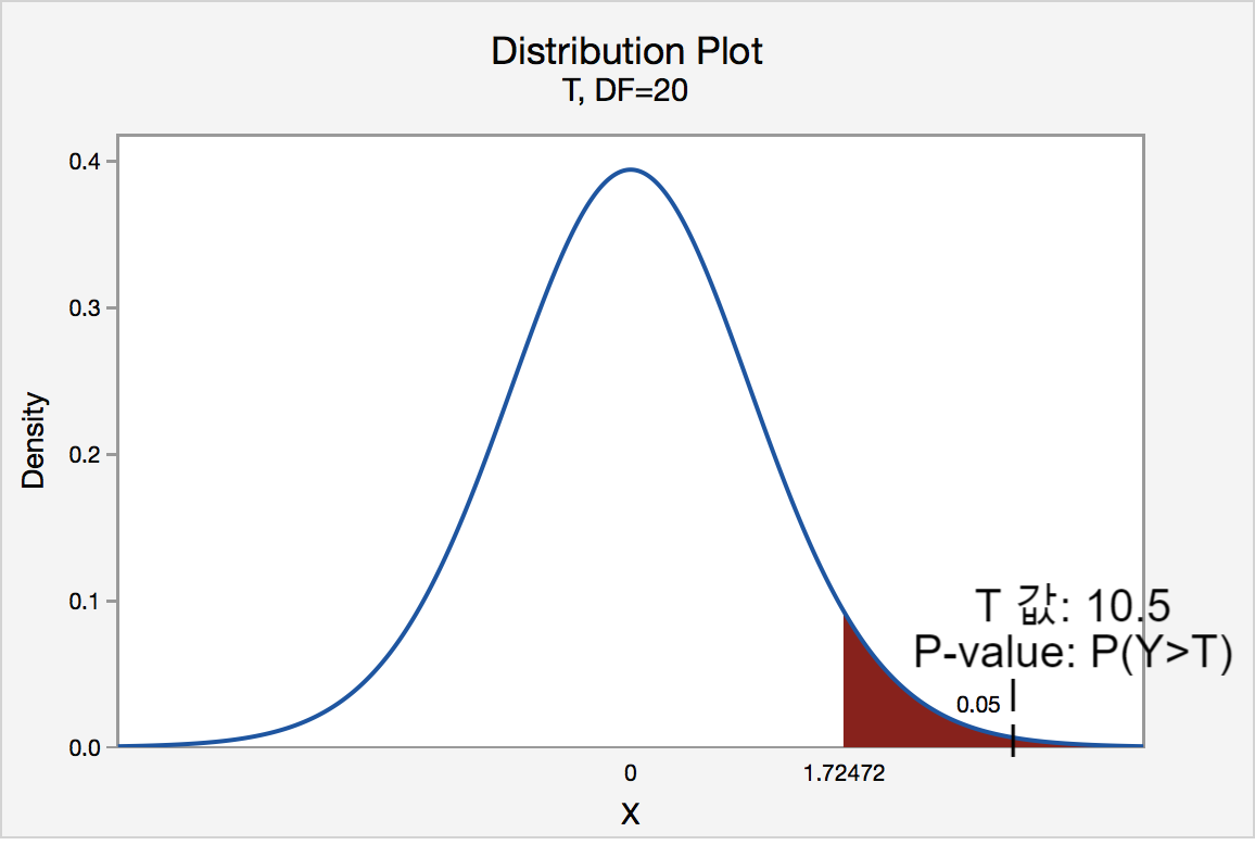 만약 T값이 10.5라면 Y가 T보다 클 확률, 즉 p-value값은 거의 0에 가까울 정도로 작은 확률값을 가진다. 즉 T 값이 크면 p-value는 작은 값을 가지고, T 값이 작으면 p-value는 큰값을 가진다.