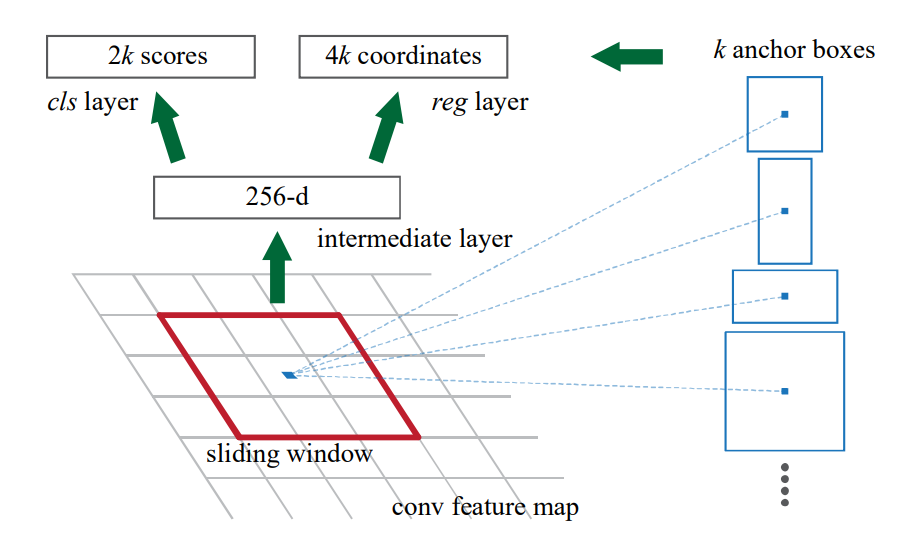 - K개의 anchor box로 feature map에서 이미지를 훑으며, 각 위치에 대해 256차원의 intermediate feature를 뽑는다.