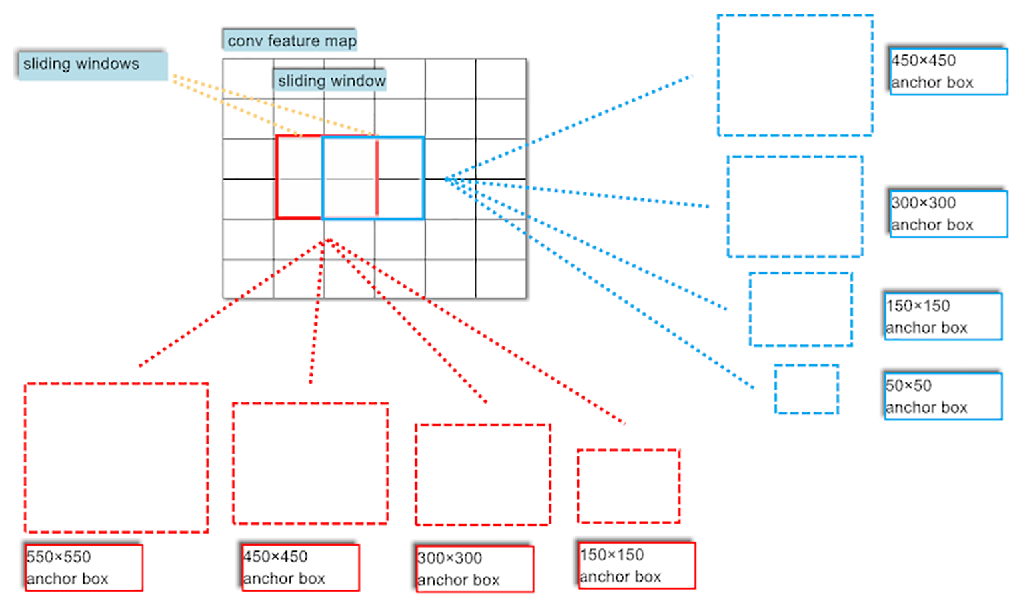 다음과 같이 이미지에서 다양한 형태의 window(anchor box)를 가지고 이미지를 sliding하며(이미지를 훑으며) 물체가 존재하는지 확인하는 과정이다.