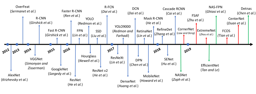 다음 도표는 딥러닝을 활용한 이미지 내 객체 검출(Object Detection) 모델의 milestone을 찍은 것이다.
