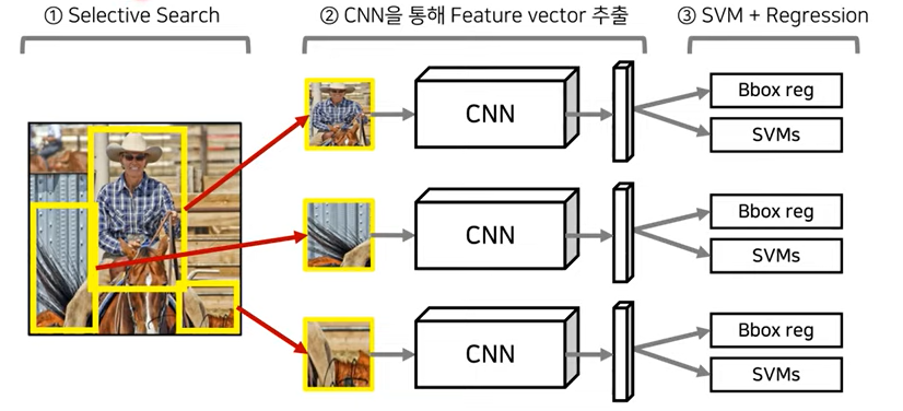 - 또한 해당 모델에서 CNN은 feature vector만 추출하는 고정된 아키텍처로, SVM과 bbox reg과 분리되어 있다. 따라서 End-to-End로 학습시켜 성능을 더욱 향상시킬 수 없다는 한계가 있다.