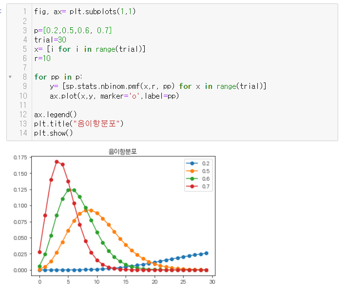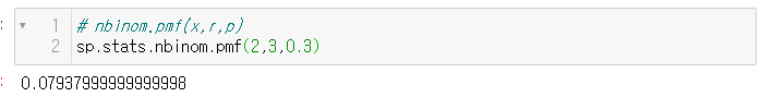 즉, 세번의 성공이 나오기까지 자유투를 2번 실패시켰을 경우의 확률분포는 다음 식에 의하여 약 0.08이다.