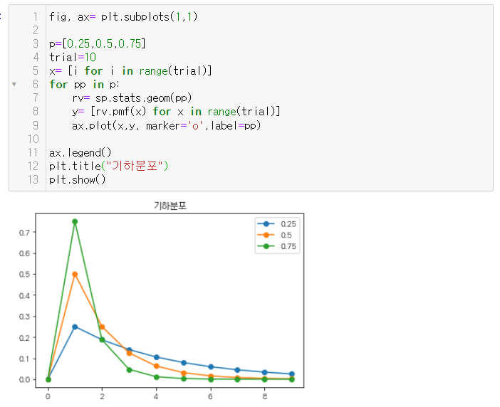 - 따라서 실패할 확률에 x-1승 한 값에 성공확률 p값을 곱해준 값이 확률변수 x에 대한 기하분포 값이다.