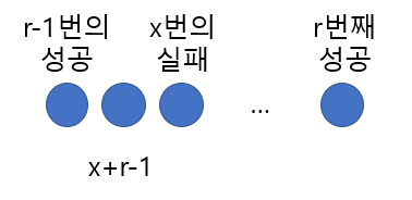 따라서, r번째 성공 전의 시행들 중에 실패시행은 x회가 들어있고 성공시행은 r-1회가 있다.