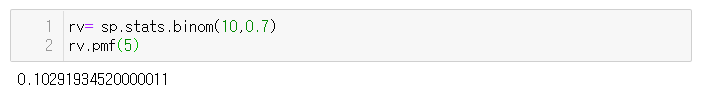 pmf 메소드를 통해 확률변수가 5일때의 이항분포 값을 출력해보았다.