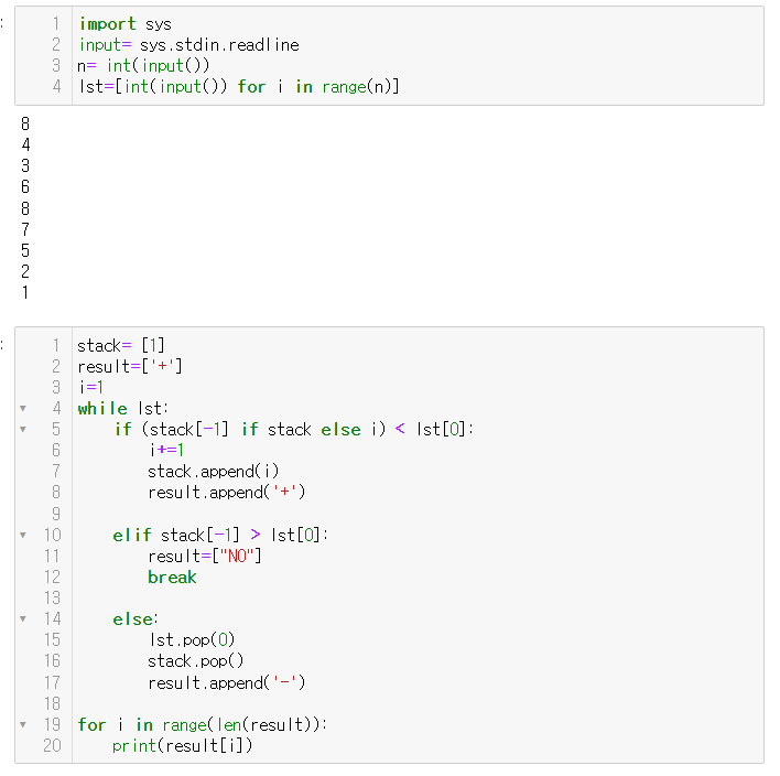- 만일 스택의 마지막 요소 값이 입력의 첫번째 값보다 크다면 입력된 수열은 만들 수 없는 수열이므로 NO를 출력한다.