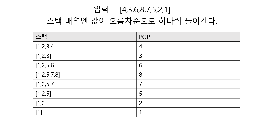 1부터 n까지에 수에 대해 차례로 [push, push, push, push, pop, pop, push, push, pop, push, push, pop, pop, pop, pop, pop] 연산을 수행하면 수열 [4, 3, 6, 8, 7, 5, 2, 1]을 얻을 수 있다.