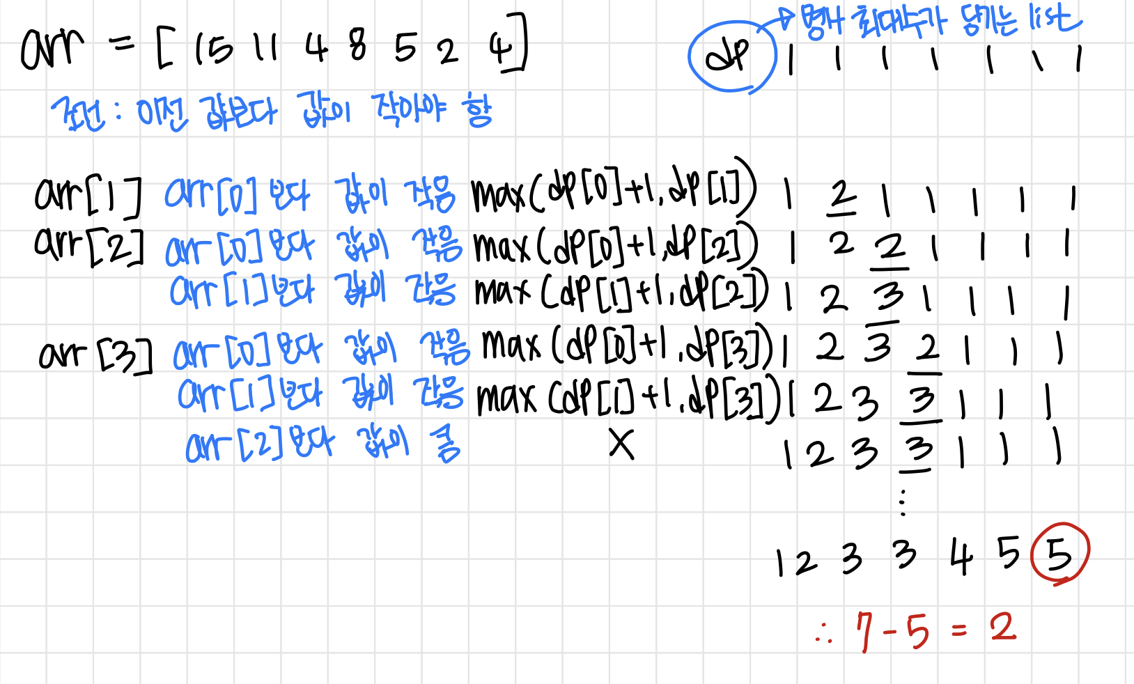 - 마지막 병사까지 연산하면 dp값은 [1,2,3,3,4,5,5]가 나온다. 즉 최대 병사 인원 수가 5명이므로 빠져야하는 병사 수는 7-5=2명이다.
