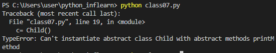 - 자식클래스에서 추상클래스를 구현하지 않으면 다음과 같은 에러가 난다.