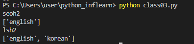 __name__메서드에선 메모리에 생성된 객체를 탑재해주는 역할을 한다.__init__메서드에선 객체 초기화를 담당한다. 클래스 메서드는 객체 생성 전에 클래스 내에서 생성된 메서드이고, 인스턴스 메서드는__init__에서 생성된 메서드를 의미한다. 따라서 인스턴스 메서드는 self의 속성으로 접근 가능해야 하고, 클래스 메서드는 클래스 내에서 생성된 메서드이기 때문에 모든 객체에서 공유된다.# class03.py class student: double_major= [] # 클래스 메서드 def __init__(self, name): self.name= name # self.double_major = [...] def printInfo(self): print(self.name) print(self.double_major) def setDoubleMajor(self, doubleMajor): self.double_major.append(doubleMajor)double_major를__init__앞에 선언함으로써 클래스 메서드로 만든다.lsh= student('seoh2') lsh.setDoubleMajor('english') lsh.printInfo() lsh2= student('lsh2') lsh2.setDoubleMajor('korean') lsh2.printInfo()