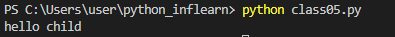 # class05.py class Parent: def __init__(self): self.what= 0 def printMethod(self): print('helloooo') class Child(Parent): def __init__(self): Parent.__init__(self) def printMethod(self): print('hello child') # --- c= Child() c.printMethod()