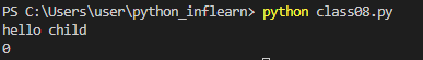 __init__메소드의 속성을 가지고 올 수 없으므로, 부모클래스의 속성을 사용하고 싶다면 자식클래스의 생성자에서 강제로 호출해줘야한다.# class04.py class Parent: def __init__(self): self.what= 0 def printMethod(self): print('helloooo') class Child(Parent): def __init__(self): pass # --- c= Child() c.printMethod() print(c.what)