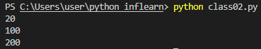 getmoney기능을 사용할 수 있다. 또한changemoney기능을 통해 해당 속성값을 변경할 수 있다.print(lsh.day) print(lsh.getmoney()) lsh.changemoney(200) print(lsh.getmoney())