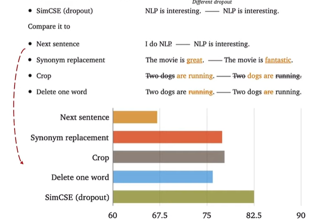 - negative pair로 완전히 다른 의미를 가지는 문장과 원래 문장과 관련없는 다른 문장들을 사용