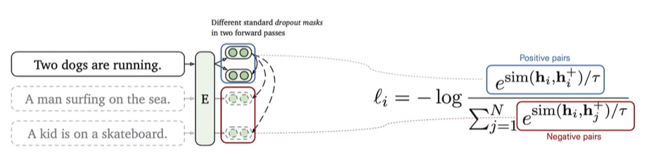 - Positive pair: 동일한 문장을 positive pair로 활용 → 기학습된 인코더에 하나의 문장을 두번 입력하여 다른representation 도출