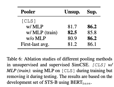 - SimCSE에선 pooling method를 변경해도 성능변화가 크지 않음