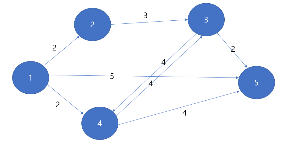 > 따라서 1번에서 모든 노드로의 최단 거리는 [0,2,5,2,5]로 나타낼 수 있다.