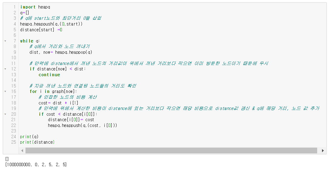 힙은 [[(거리, 노드), (거리, 노드)...]]로 표현하였고 노드번호에 따른 최단거리는 [노드1에 대한 거리, 노드2에 대한 거리...]로 표현하였다.
