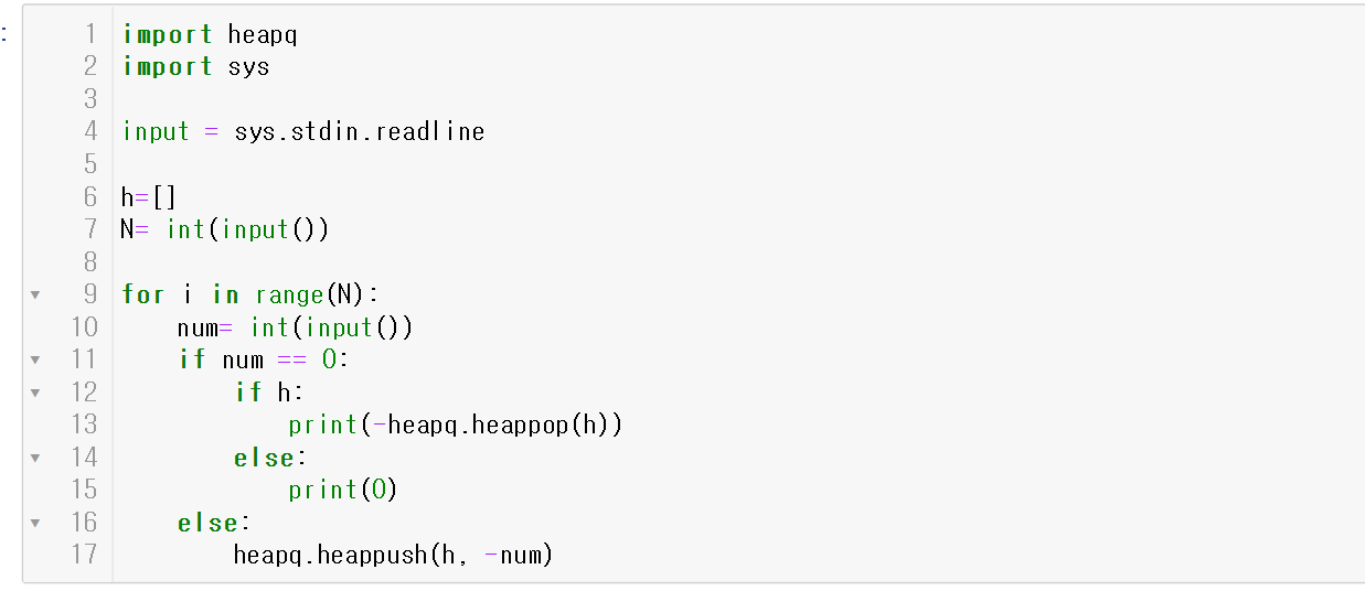 힙은 요소를 꺼낼때 가장 작은 값부터 뽑아온다. 이를 활용하여 가장 큰값부터 뽑아오게 하기 위해 요소에 -를 붙여서 가장 큰값을 가장 작은 값으로 변환하여 힙에 넣고 뺄 때는 -부호를 다시 붙여서 양수로 뽑히게끔 만들었다.