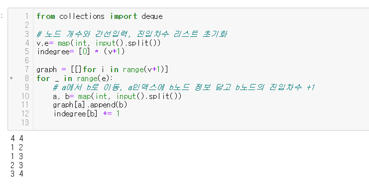 7. 노드 4의 진입차수가 0이 되므로 큐에 넣어준다, -> [4]