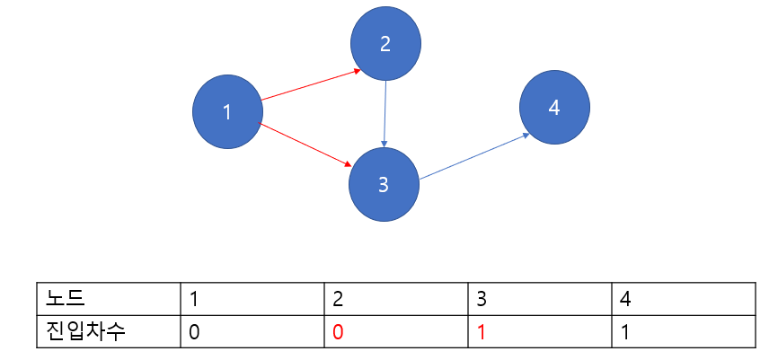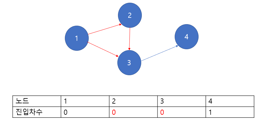 step1. 진입차수가 0인, 즉 노드로 들어오는 간선 개수가 하나도 없는 노드를 큐에 넣는다.