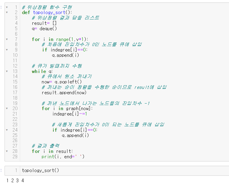 위의 예시를 위상정렬 알고리즘으로 구현해보자.