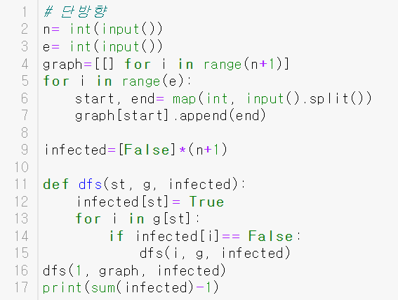 ▷ 그러나 문제에 따르면 1번 노드는 2,3번 노드 뿐만 아니라 4번 노드와도 연결되어있기 때문에 3을 출력해야한다. 이를 위해선 연결되어 있는 노드는 두 방향에서 연결되어 있음을 나타내는 양방향 그래프를 사용해야하기 때문에 양방향 그래프를 나타내는 코드로 다시 구현했다.