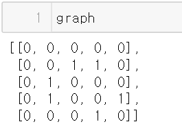 단방향과 달리 행렬로 그래프를 표현했고 두 노드가 연결되어 있으면 두 노드의 행렬위치 모두에 다음과 같이 1을 넣어주었다.