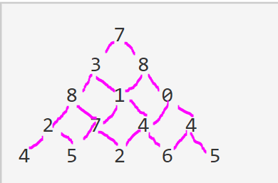 위부터 아래로 내려오며 더한 값들이 최대가 되도록 하는 방법을 사용했다. 더한 값들이 최대가 되기 위해선 수에 더할 윗 값들 중 더 큰 수를 더할 수 있을 것이다. 한 행에서 맨 앞에 위치한 수나 맨 마지막에 위치한 수의 경우 위의 줄에서 더할 수 있는 수가 하나밖에 없으므로 다음 그림과 같이 그릴 수 있다.